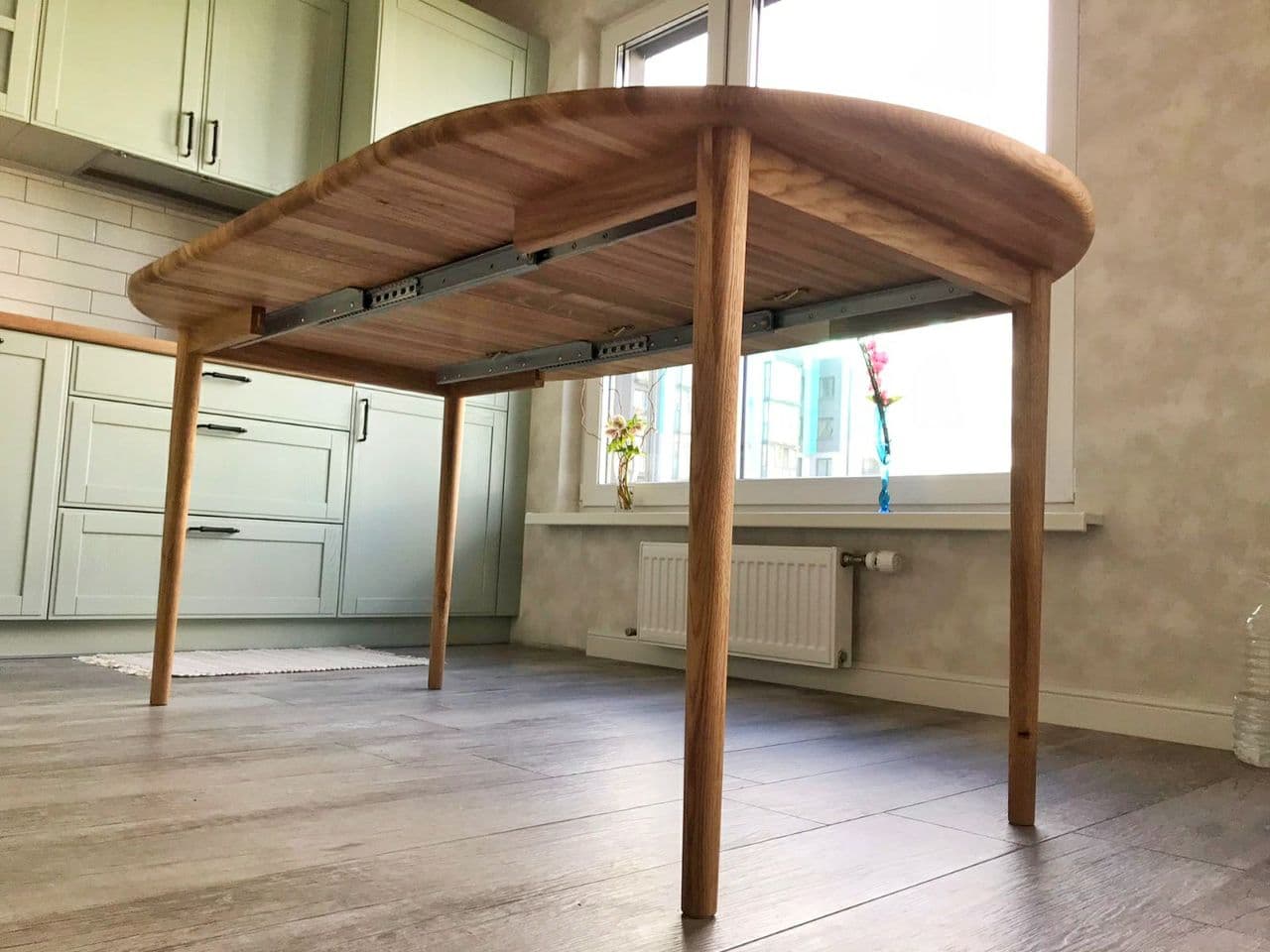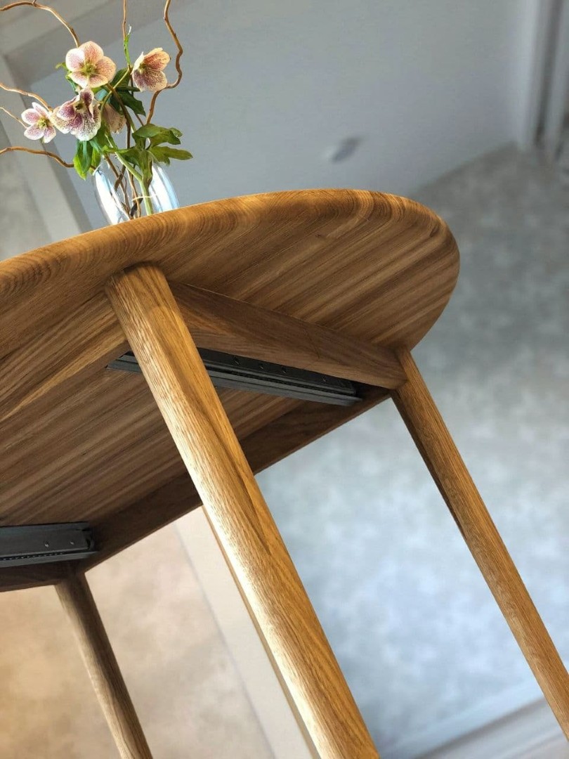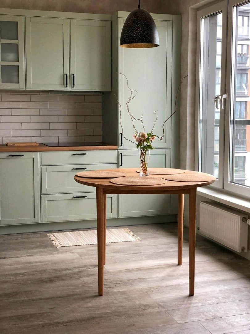 Еще один дубовый стол занял почетное место на на кухне у наших криентов. Крепкий, но в то же время воздушный. Он имеет безцарговую систему раздвижения. В сложенном виде диаметр стола - 100см, а разложить его можно до 140 иди 180см благодаря двум вставкам.