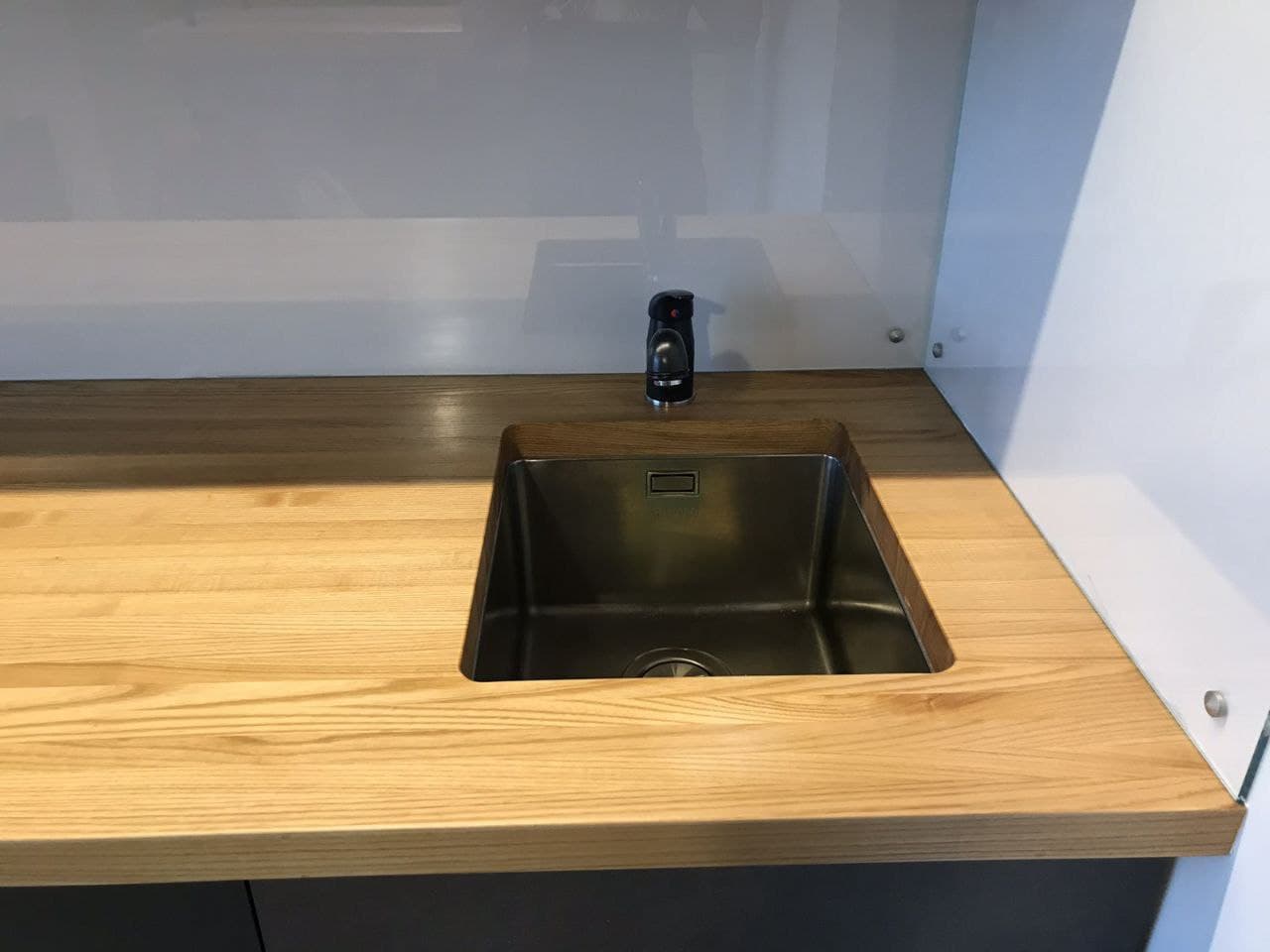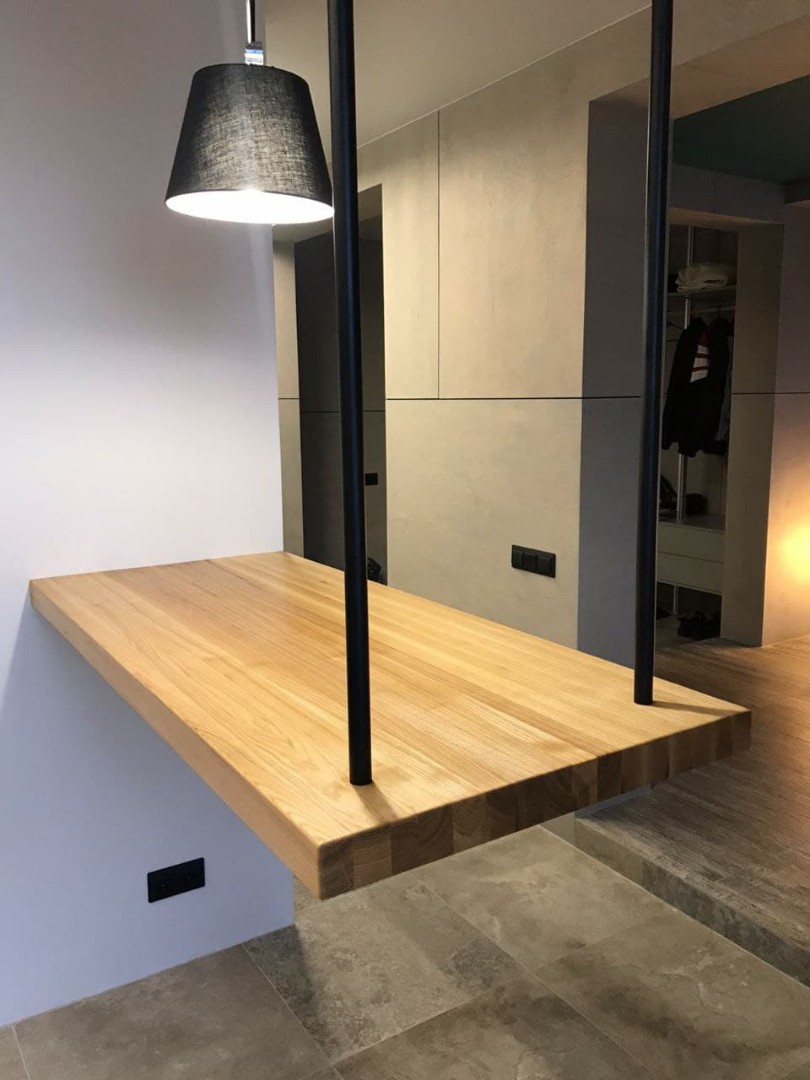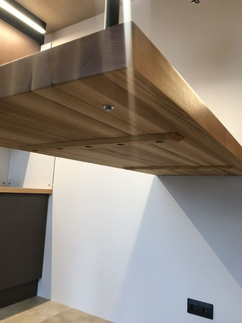 Столешница из натурального дерева отлично подходит в качестве рабочей поверхности шкафов и тумб. Сочетаясь с поверхностью кухонного стола или барной стойки создается впечатление визуального единства для интерьера вашей кухни.