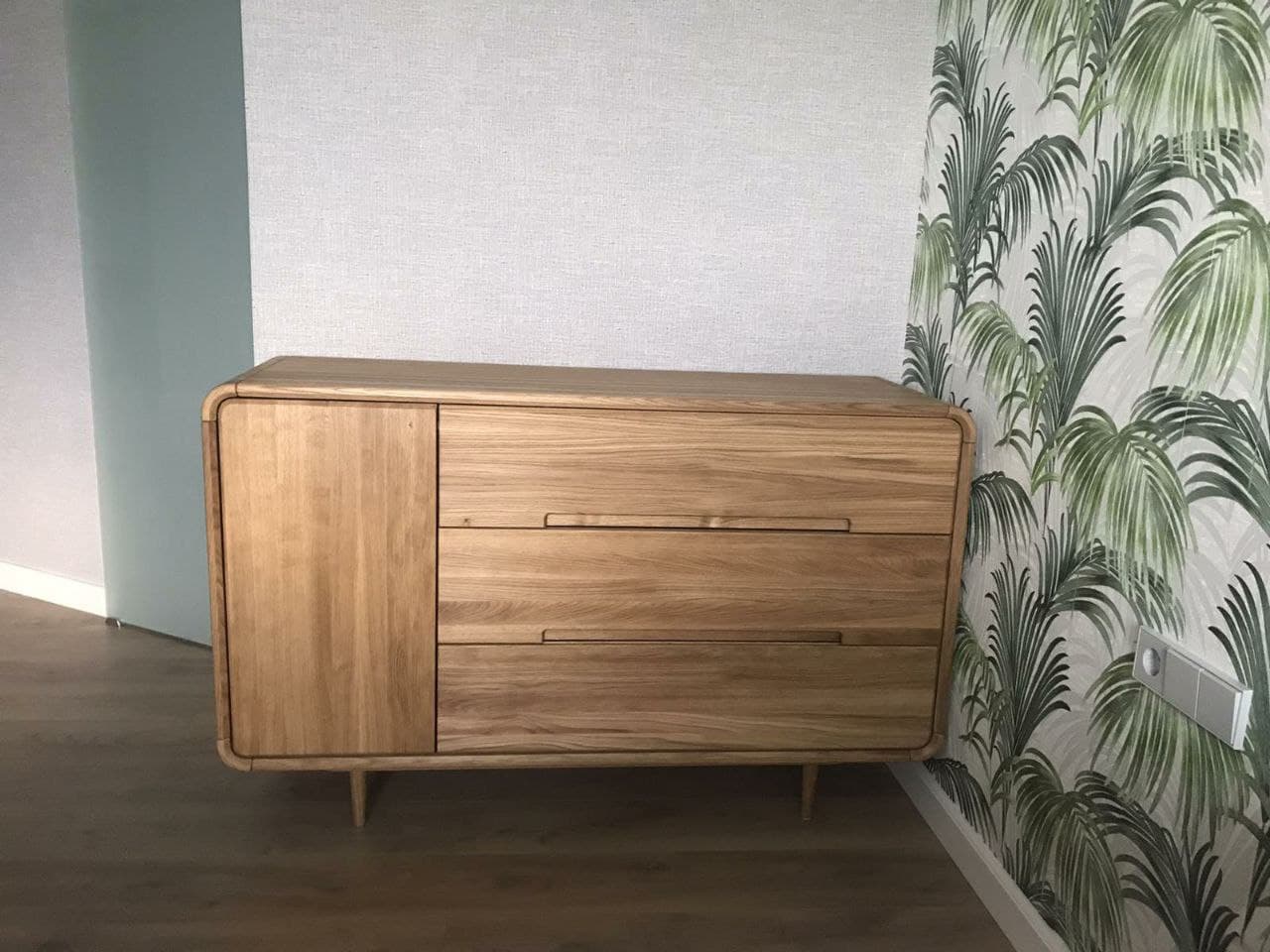 Тума из дуба, выполненная в скандинавском стите и покрытая натуральным маслом, отлично впишется в любой интерьер. Элегантные ножки не только придают мебели легкость и утонченность, но также имеют плюсы со стороны уборки. Робот-пылесос отлично справится со своей работой под тумбой. Дверца тумбы легко открывается одним нажатием.