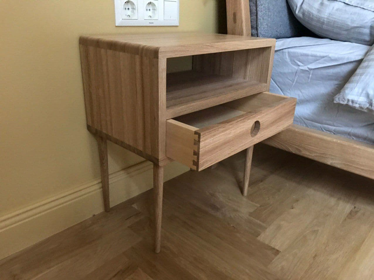 Прикроватная тумба на длинных тонких ножках добавит легкости в интерьер вашей спальной комнаты. А незабываемый аромат натурального дерева определенно поспособствует хорошему сну.